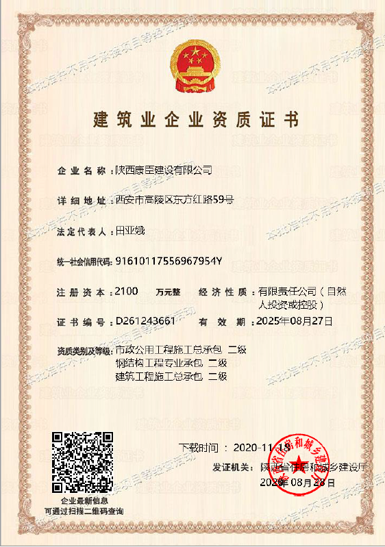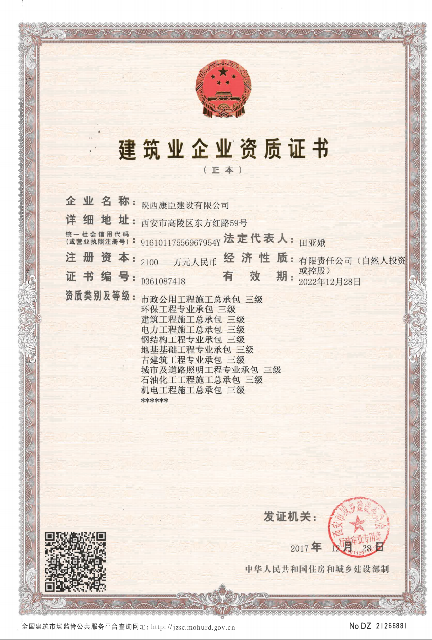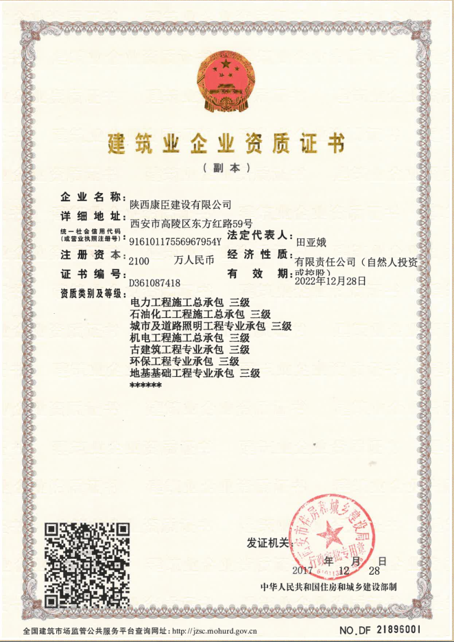 陜西康臣建設(shè)有限公司(簡稱康臣建設(shè))始建于2010年6月,注冊資金2100萬元整。公司是從事市政公用工程、房屋建筑工程、城市及道路照明工程、電力工程、石油化工工程為主的企業(yè),具有建筑工程施工總承包二級、市政公用工程施工總承包二級、鋼結(jié)構(gòu)工程施工專業(yè)承包二級、城市及道路照明工程專業(yè)承包、電力工程施工總承包、石油化工工程施工總承包、環(huán)保工程專業(yè)承包、機(jī)電工程施工總承包、地基基礎(chǔ)工程專業(yè)...more+